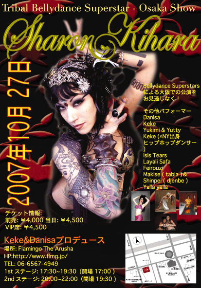 Sharon Kihara - Tribal Bellydance Superstar Workshop シャロン・キハラ ワークショップ アメリカベリーダンス スーパースターのメンバーとして活躍中のシャロン・キハラのワークショップを開催! ■スケジュール ワークショップ1 2007年10月24日 19:00〜22:00 場所:クロスロード梅田 ハッスル&フロー:トライバルヒュージョンダンサーの為のテクニック、ボディークリエイティビティーとコンディショニングの強化 ワークショップ2 2007年10月25日 19:00〜22:00 場所:クロスロード梅田 フォルクロア/民間伝承