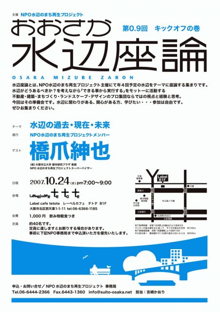 【水辺通信より転載】 水辺のまち再生プロジェクトも誕生して丸4年が過ぎました。 いろんなことを経験し、多くの人と出会い、影響を受けつつも 普遍のコンセプトを確認できた4年でした。 これまでは、がむしゃらに走りながら経験を蓄えるのみ、でしたが 今後はみんなにもらったその貴重なストックを使いながら新たな ステージに向います。 その第1弾として 「水辺座論(ミズベザロンとよみます)」 をご案内します。 水辺座論とは、NPO水辺のまち再生プロジェクト主催にて 年4回予定の水辺をテーマに座論する集まりで、今回はその