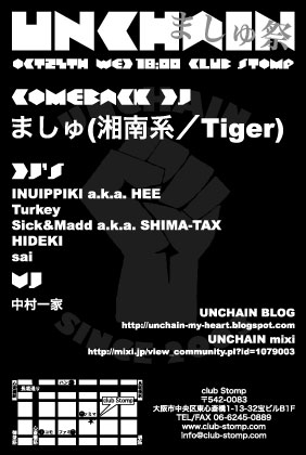 ●UNCHAIN● ■2007.10.24(Wed) open18:00〜close23:00 ¥1500(with 1drink) ■!!DJ!! ましゅ(tiger) ■DJ INUIPPIKI a.k.a HEE TURKEY Sick&Madd a.k.a.SIMA-TAX サイトウヒデキ a.k.a HIDEKI sai ■VJ 中村一家 □12月に周年を迎えるアンチェイン!!その前試合となる今回は、前回湘南遠征により欠場していた彼!そう!彼!!ましゅをフィーチャーしてまいります!! ひと夏水着ギャルを相手しまくってきた彼のギャル泣かせなPast summer