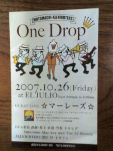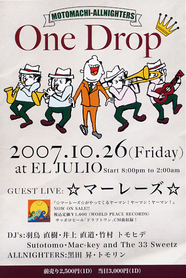 2006サッポロドラフトワンのCMソング ☆マーレーズ☆群馬初ライブ 10月26日金曜日 MOTOMACHI-ALLNIGHTERSプレゼンツ 「One Drop@高崎EL JULIO」 ※慈光通りズズランななめ前のオープンカフェ ■GUEST LIVE:☆マーレーズ☆ ※当日ライブは2ステージございます。 1stステージ/21:30〜(予定) 2ndステージ/24:30〜(予定) ☆マーレーズ☆プロフィール 2005年正月、知人のラスタマンさんの提案により結成。ふたりは☆マーレーズ☆(ひよまーれー、つやまーれー)と名付けられ、ジャアを信じバビロンと戦うために、アコースティックレゲ