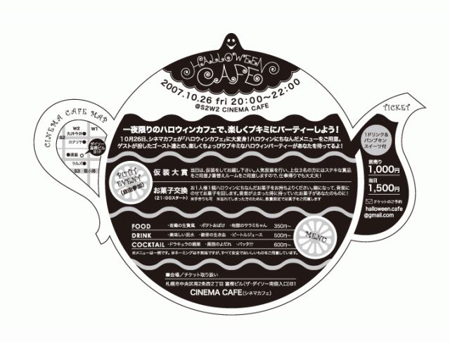 告知失礼します。 来週金曜日、札幌市中央区南2西2のシネマカフェにて「ハロウィンカフェ」と称 した誰でも参加できるカフェ形式の仮装ハロウィンパーティーを行います。ぜひお越 しください♪ (仮装は強制ではありません) 以下詳細↓ 10月26日(金)、南2西2のシネマカフェが、「ハロウィンカフェ」に大変身!! ハロウィンの特別メニューが、あなたを待ってるよ! 100インチのスクリーンで流れるハロウィンフィルムを鑑賞しながら、 ゲストが扮したゴースト達と、楽しくブキミにパーティーしよう! ■メニュー一例 FOOD・