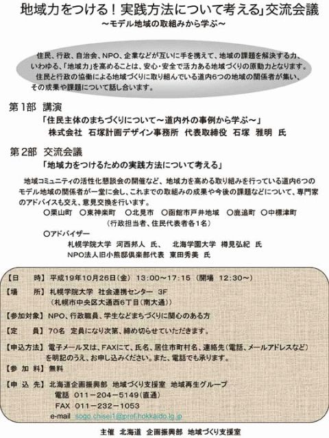 住民、行政、自治会、NPO、企業などが互いに手を携えて、地域の課題を解決する力、いわゆる、「地域力」を高めることは、安心・安全で活力ある地域づくりの原動力となります。 住民と行政の協働による地域づくりに取り組んでいる道内6つの地域の関係者が集い、その成果や課題について話し合います。 13:00〜17:15 札幌学院大学社会連携センター 詳細、申し込みは以下のURLです。 http://www.pref.hokkaido.lg.jp/sk/ckk/chicho/chiikiryoku/191026kaigi/