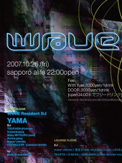 クールでちょっとオトナな夜遊び空間。 ぜひ早い時間からアソビにキテクダサイ♪♪♪ ◆『W@VE』 10.26.fri> 22:00start @ Sapporo alife ■MAIN FLOOR■ ◆W@VE:RESIDENT DJ DJ YAMA ◆DJs Tsukada [FUSION] 9 [HACIENDA] Arima [alife] baby mitsuru [alife] maco [W@VE] FLYWALKER [W@VE.CANADA] ◆VJs shin.w・ENDY ■LOUNGE FLOOR■ ◆DJs maco [W@VE] LOVE[alife] 玉王[come on a my house] JERONIMO[come on a my house] TAKETO U-$UKE ◆Fee DAY:3000yen/1d w/f:2000y
