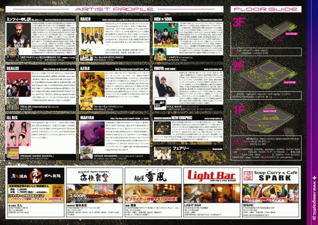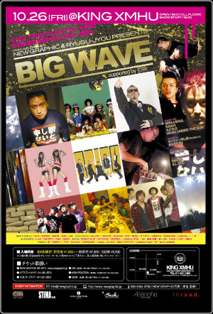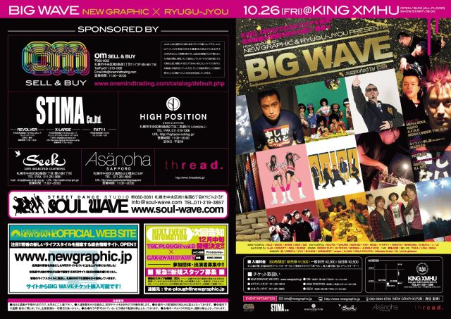 2007.10.26(金) BIG WAVE @札幌KING XMHU [ http://www.king-xmhu.com/ ] OPEN / 18:00 SHOW START / 19:00 ALL NIGHT 入場料金 300枚限定! 前売券 \1,500 / 一般前売 \2,000 / 当日券 \2,500 ※入場の際、別途500円1ドリンクオーダーをして頂きますのでご了承下さい。 再入場可能(但し1ドリンクオーダー) -GUEST DJ- ミッツィー申し訳(申し訳ないと) MARYAN -GUEST LIVE- MEN★SOUL RAICO A.F.R.O MOSH UNDER THE SUN -GUEST SOUND- REALIZE GUEST DANCE RIKIYA ILL BEE INFO : NEW GRAPHIC htt