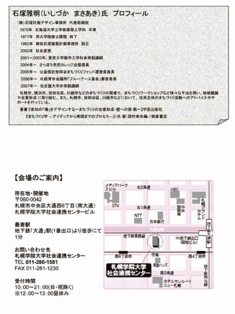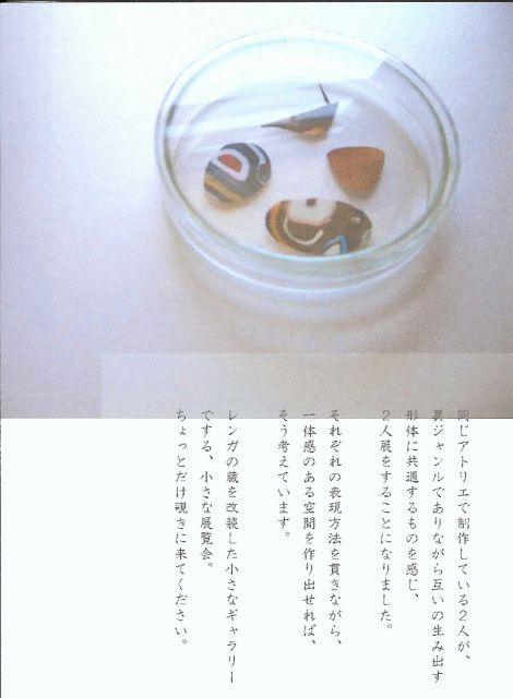 ■「平山ビルというシャーレの中」額田春加・船山奈月2人展 「同じアトリエで制作している2人が、 異ジャンルでありながら互いの生み出す 形体に共通するものを感じ 2人展をすることになりました。 それぞれの表現方法を貫きながら 一体感のある空間を作り出せれば、 そう考えています。」 場所;ギャラリー/カフェ 旧鎌田志ちや 住所;札幌市中央区南10条西9丁目1−30 電話;011-594-8681 場所はこちら↓ http://mixi.jp/view_bbs.pl?id=10210438&comm_id=1204236 http://www.tonden-street.com/ 日にち; 2007年 10