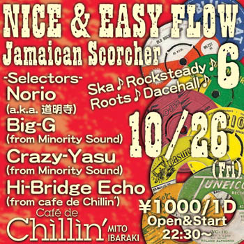 10/26(金)『NICE & EASY FLOW vol.6』(REGGAE) 〜Jamaican Scorcher〜 Ska,Rocksteady,Roots,Dancehall 【Selector】 ・Norio (from道明寺) ・HI BRIDGE ECHO (from cafe de Chillin') ・Big-G (from Minority) ・Crazy-Yasu (from Minority) 10/26(金) OPEN&START 22:30〜 Adm: \1000/1drink