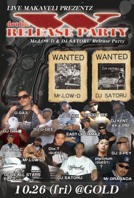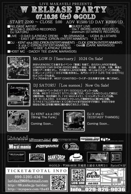 2007'10/26 fri LIVE MAKAVELI PRESENTZ W RELEASE PARTY -@GOLD- 茨城県土浦市大和町2-1 patioビル3F -TICKET- ADV:1500/1D DAY:2000/1D -OPEN- 22:00〜 〜05:00 -RELEASE Artist- Mr.LOW-D (BEER-G RECORDZ) DJ SATORU -LIVE- O.G43 (LA’RIDAZ CREW) MR.GRANADA Dix-T (BORN HOOD RECORDS) platinam (STARNITE RECORDS) EAST UP GAMAZ (ORION ENTERTAINMENT) UC84 ALLSTARS EL13 -DJ- KENT a.k.a 282 (ORION ENTERTAINMENT) CLICK a.k.a 8Ball (ORION ENTERTAINMENT) X