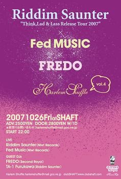★★★★★★★★★★★★★★★★★★★★★★★★★★★★★★ riddim saunter"Think,Lad & Lass RELEASE tour" --Harlem Shuffle vol.4-- ★★★★★★★★★★★★★★★★★★★★★★★★★★★★★★ 2007.10.26.(Fri) @Club SHAFT (Sendai) 22:00〜 ADV¥2500(1D) DOOR¥2800(1D) LIVE:riddim saunter FedMUSIC GUEST DJS*松野 光紀(FREDO) 古川 太一(riddim saunter) ::club shaft:: http://www.clubshaft.com/ ::riddim