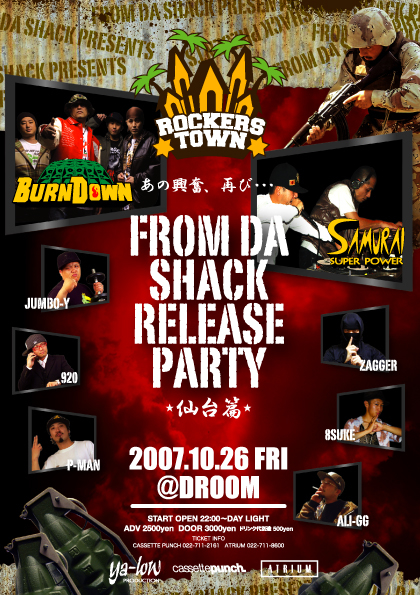 GUEST SOUND: BURN DOWN SAMURAI superpower DEEJAY: JUMBO-Y 920 P-MAN ALI-GG ZAGGER 8suke HOST SOUND: FROM DA SHACK PM10:00START ADV:2500yen DOOR:3000yen(ドリンク代別) チケット取り扱い店:カセットパンチ、ATRIUM[LEGAL RIGHT aoba st] 盛大なリリースパーティに相応しい日本レゲエサウンドを代表する2組のBIG SOUNDが仙台に駆けつけてくれます。当日は仙台はもちろん、東北のレゲエ好きが集まるべくこの日を見逃すなーーーー!!!! TOTAL INFO:http://www.fromdashack.net/(PC版) http://h