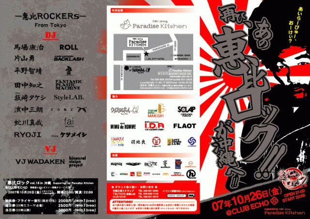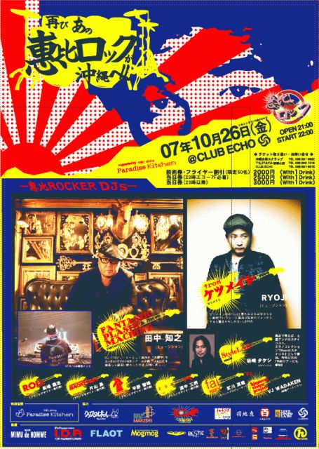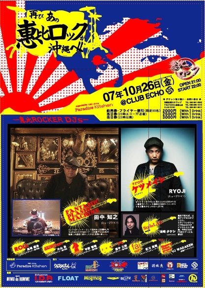 惠比ロックvol.18 in 沖縄 Supported by Paradise Kitchen 2007年10月26日(金) OPEN 21:00/START22:00/CLOSE 5:00 CLUB ECHO(国際通り近くゼファー那覇タワービル7階) [ファッションと音楽と映像を絡めたオシャレクラブパーティー!!ロック編] 【出演者】 DJ/ミュージシャン ★田中知之 FANTASTIC PLASTIC MACHINE(FPM) 今年3月30日のFPMBツアーin沖縄では900名を動員し大盛況に終わったのは、記憶に新しい。 ★RYOJI (from ケツメイシ) ケツメイシのRYOJIと言わなければ分からない厳密でハウシーな選曲は従来のファン