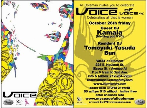friday oct 26th...ur invited to celebrate with Voice of voice NYC in the Vault @ Element...w/ resident djs Tomo Yasuda & Bun (Boon)...join our monthly gathering in october as we celebrate our grandmothers, mothers, aunties, sisters, cousins, wives and friends: "All that is Woman" Breast Cancer Aware-ness Party pt. 3...w/ our guest Kamala of The Melting Pot NYC sharin her beauti-full voice…come out and share sum good ol' fashioned fun!! dancin, sweatin and drinkin to the wee hours of the morn