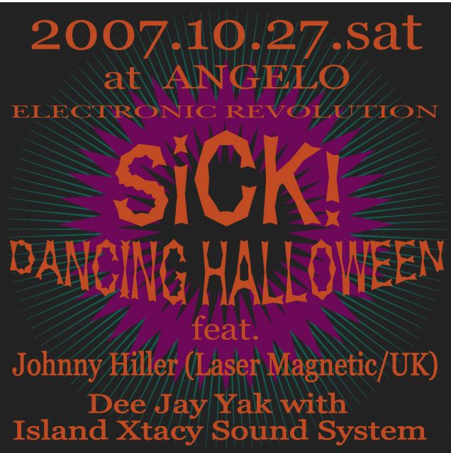 NEXT SiCK DANCING HALLOWEEN! 2007.10.27(SAT) START22:00 @ANGELO CHARGE 1500YEN with 1drink and All drink 500yen 仮装して遊びに来てくれた方にはオリジナルプレゼントあり 今年もやってきたDANCING HALLOWEEN!今回は1950年代〜70年代黄金期のHi-Fi/Audioを現代に蘇らせた国内でも珍しいSR用ヴィンテージサウンドシステムIsland Xtacy Sound System with DJ Yak、