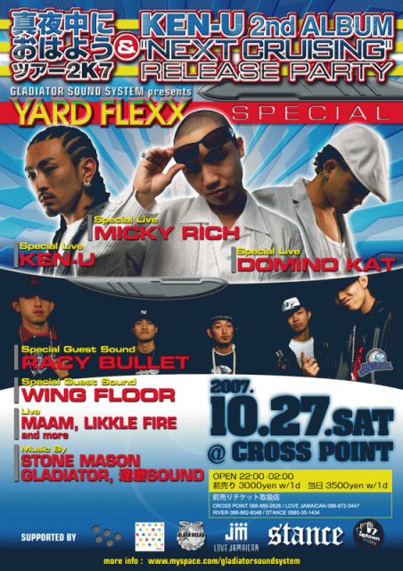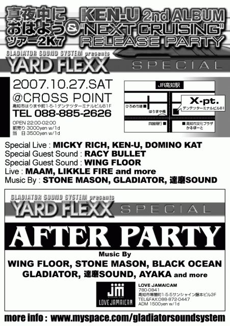 来月10/27(土)はYARD FLEXX SPECIAL!! NEW ALBUMをリリースしたばかりの日本を代表するアーティスト、MICKY RICH、 KEN-U、 DOMINO KATのSPECIAL LIVE、サウンドでは全国で活動を展開するビックサウンドRACY BULLET、間違いなく四国を代表するサウンドWING FLOORをゲストに迎えお送りします! GLADIATOR SOUND SYSTEM presents 『YARD FLEXX SPECIAL』 真夜中におはようツアー&KEN-U 2nd ALBUM "NEXT CRUISING"RELEASE PARTY 2007/10/27(SAT) 高知@CROSS POINT OPEN22:00-2:00 前売り3000YEN/1D 当日3500YEN/1D