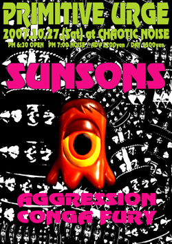 ● 2007年10月27日(土) 「PRIMITIVE URGE #11」 PM 6:30 OPEN / PM 7:00 NOISE ADV 1200円(+ 1Drink) / DAY 1500円(+ 1Drink) Feat : SUNSONS (神戸) / AGGRESSION / CONGA FURY 港町"神戸"より伝説のサザンロックチーム"SUNSUNS"が遂にやって来ま〜す!! 楽しみッスね〜!! カルトドラマー"MANOWAR"の炸裂する馬鹿テクを君は見ないで死ねるのかぁぁ〜〜(T_T)