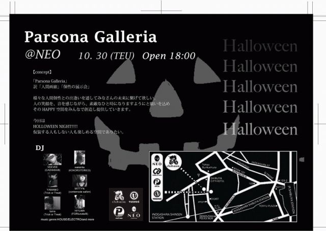 こんにちは^^ 美容師や毛髪診断士、IT事業、DJ、 などなど 多岐に活動している ひゆーまんと申します* この場を お借りして 告知させてください* 10/30(TUE) HAPPY HELLOWEEN!!!! 【Parsona Galleria】@Neo OPEN18:00〜23:30 entrance \2500/1d w/f \2000/1d *今回はHalloween candyプレゼントです♪ Place:【Neo】 渋谷道玄坂 セブンイレブンの角を左に曲がり まっすぐ進むを 左側に[club asia]が見えます。 その 正面のビル5Fの2フロアのバーラウン