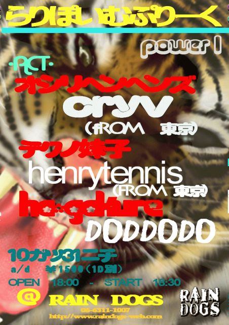告知失礼します!! イベントします〇 *らりぽいむぷりーく*power1 -ACT- オシリペンペンズ cryv(from 東京) テクノ妹子 henrytennis(from 東京) ha-gakure DODDODO 10ガツ31ニチ A・D ¥1500(1D別) OPEN 18:00−STRAT 18:30 @梅田RAIN DOGS http://www.raindogs-web.com/ ハロウィンに負けないくらいのイベントです!! らりってぽいむる音聴いてぷりーくぷりーく ぷ・り・い・く!! 是非是非来てください!! よろしくお願いします!!!