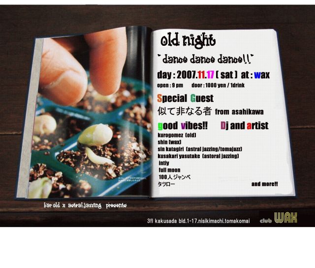 明日はWAX集合〜 【Old、NIGHT 〜DANCE!DANCE!DANCE!】 DAY:11月17日(SAT) AT:WAX OPEN:9時〜朝まで DOOR:1000円/1DRINK GUEST LIVE: 『似て非なる者』from 旭川 DJ: SIHN(WAX) KUROGOME'Z(OLD) SIN KATAGIRI(ASTRAL JAZZING) KUSAKARI YASUTAKE(ASTRAL JAZZING) INITY FULL MOON LIVE: 100人ジャンベ タツロー Decoration: じゅん(フリーダム)