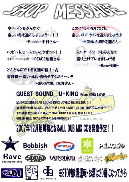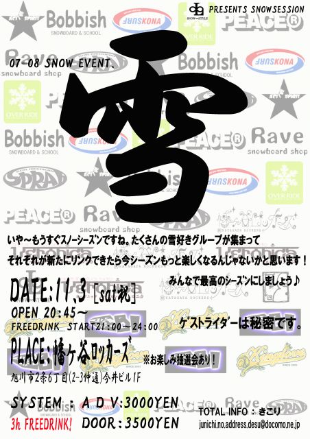 ガールズボーダーの皆さんにイベント告知です☆ 今回、DRE@MER*もイベント関わってますので みなさん こぞって参加お待ちしております。 ------------------------------------ スノーシーズンが始まる前に みんなで前夜祭しませんか〜? 旭川近郊のスノー好きが集まって 新しい仲間を作りましょう 詳細は、こちらです。 日時 11月3日(土曜日)文化の日 21:00〜24:00 場所 幡ヶ谷ロッカーズ 旭川市2条6丁目(2-3仲通)今井ビル1F System 前売り 3,0