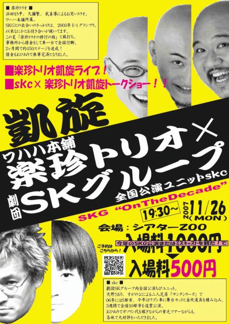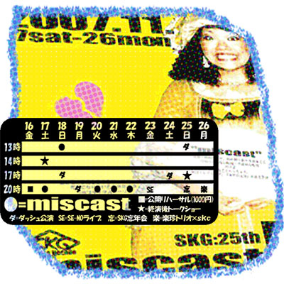 11月25日(日)千秋楽の公演チケットは完売いたしました! ■■劇団SKグループ25th■■ ★★『 ミスキャスト! 』★★ ■■11/17(sat) -26(sun)■■ 温泉宿の夢見る恋するジュリエット。 元気になりたい乙女のためのTHEブサイクストーリー!! 劇団SKグループの、『来年の元気』が出る芝居! ■■inシアターZOO/\2000(学生\1500)■■ 10周年突入イベント!ワハハ本舗の楽珍トリオ札幌凱旋! 2軍SK-ダッシュによるスキマ公演『A。』も! 詳細は★http://www1.plala.or.jp/skg/★ 携帯用★http://www1.plala.or.jp/skg/i/★