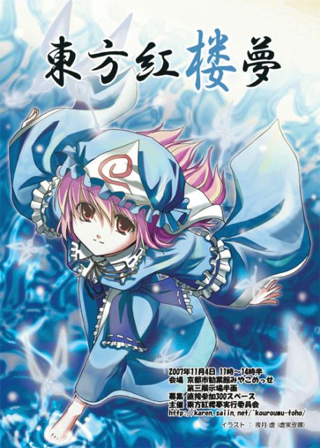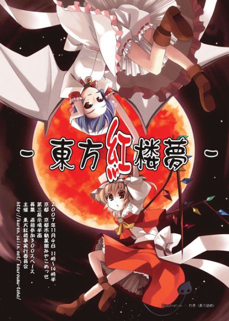 いつもどおりのイベント告知です 今回もっていうか、本日先ほどに申し込みを締め切りましたが 東方紅楼夢 (3回目) 2007年11月4日(日) 11:00〜14:30 京都・京都市勧業館みやこめっせ 第三展示場 http://karen.saiin.net/~kouroumu-toho/ 主催:東方紅楼夢実行委員会 最終締め切りのサークル一覧はしばしお待ちください
