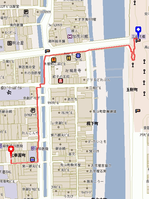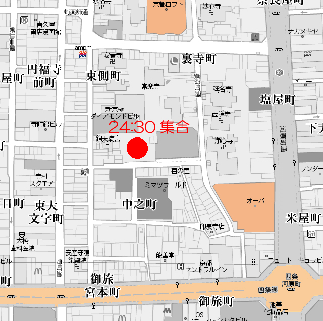 毎度ー。ノ だいたい月一開催のin鬼です(gdgd 管理人電子トラブルのため、また副管理人トピ立てた次第ですがよろしくお願いします! 秋ですね。 個人的には寒くなっていくのは苦手です以下略 おまちどうさんです!第8回開催です! 今回も副管理人出張開催です。 以前「京都でも!」ちう要望があったようなんで、京都でここぞというエリアを選びました河原町。 集合場所:阪急河原町駅下車2分新京極公園(画像赤丸印位置 集合時間:24時30分までに集ってください。 参加費:1