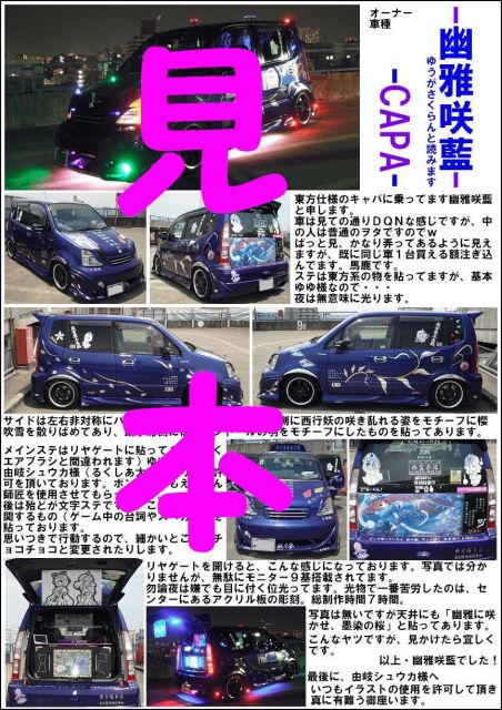 某うぬけんさんが紅楼夢にサークル参加することになりましたので、前回の例大祭同様「東方痛車会」の本を作成しようと言う企画。 そして、前回同様、幽雅が作成する事になりそうなので(っつーかそのつもりなので)皆さんご協力お願いします。 自分の車を載せろ!ってな方は参加表明お願いします。 前回参加した方も参加可能です。 チャリやラジコンでもOKです。 必要なもの ・車(勿論東方関連のステを貼った痛車) ・↑の写真 ・東方・車に対する熱い想い ・その他色々 写真やコメントに関しては参加確定後、幽雅まで連絡