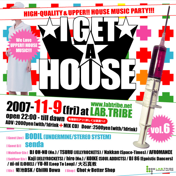HIGH-QUALITY & UPPER!! HOUSE MUSIC PARTY!!! I GET A HOUSE vol.6 2007/11/9(FRI) open 22:00 - till dawn at LAB.TRIBE http://www.labtribe.net/ ADV:2000yen(with/1drink+MIX CD) Door:2500yen(with/1drink) ▼Doorのみ以下の割引があります。 [ガク割] 学生証提示で300円引き [ツレ割] 友達4以上同時入場で300円引き ※先に入っている友達は対象外 <!>ガク・ツレ併用で500円引き! [トク割] 白衣orナースでご入場の方500円引き。さらにMIX CDプレゼント!! ※他割引との併用不可 [ Guest Live ] BO