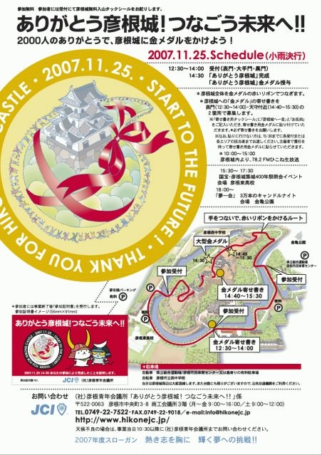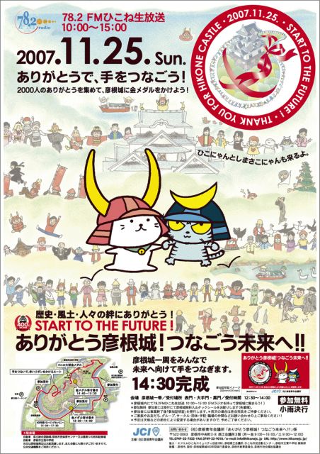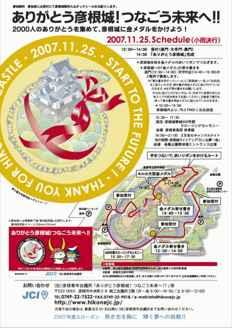 彦根のまちが好きな方、彦根在住の方、彦根出身の方、彦根に仕事や学校でこられる方、彦根で活動をされている方、国宝・彦根城築城400年祭を盛り上げようと思っている方、彦根城・琵琶湖・佐和山城・ひこにゃん・さこにゃん・みつにゃん・井伊直弼・石田三成・島左近を愛する方・・・ 彦根に関わる全ての方へ 今日は国宝・彦根城築城400年祭のファイナルを飾る事業を紹介します。 国宝・彦根城築城400年祭の最終日11月25日(日)に (社)彦根青年会議所主催で 「ありがとう彦根城!つなごう未来へ!!」という事業を開催します。 当事業