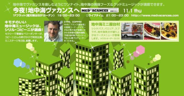 どうも、シリルです。 調子はどげんですか? Medvacancesを開催し始めて3年になるけど、「ね〜シリル、いつも行きたいけど、夜中はきつい〜」という声がよーでてる。 ご安心ください。 11月1日(木)に夕方でスタート、終電で帰れるMedvacancesを特別に用意してます♪! しかも、入場無料!え〜!ありえな〜い!はい、有り得る! 詳細を以下に送りますので、チェックしてね。 しかし、今回はNEWのもの登場するばい!、、、食べ物です! お楽しみに! =======================