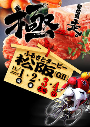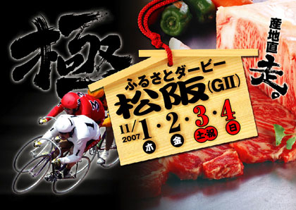 ふるさとダービー 松阪競輪場 (47♯) 2007年11月01日(木) 〜 11月04日(日) ◆主な出場予定選手◆ 小嶋敬二(石川) 手島慶介(群馬) 渡邉晴智(静岡) 伏見俊昭(福島) 佐藤慎太郎(福島) 後閑信一(群馬) 岩見潤(三重) 松岡彰洋(三重)  海田和裕(三重) 濱口高彰(岐阜)  他 http://keirin.jp/pc/dfw/dataplaza/guest/entrymemberKCD=47&KST=20071101 ◆テレビ実況中継予定◆ ・スピードチャンネル390ch(4日間) ・オッズ専用チャンネル391ch(4日間) ・三重テレビ 1日、3日、4日(15:00〜16:50)