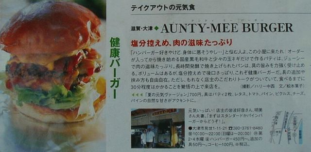 かつて、雑談のトピで話してました、よしゆきさんオススメの ハンバーガー屋さん「AUNTY MEE」でプチオフを開催します。 22時まで開いてるそうなので、来られる方は顔だけでも出していただければ 場所はこの辺。 http://map.yahoo.co.jp/pl?lat=35.03682111&lon=135.86350556&ac=25201&az=222.1.11.1 アヤハディオの隣です。 車を置くスペースがそんなになさそうなので、 また参加台数を見て、付近の迷惑にならないように考えましょか。 告知してから時間もあまりないですが、 2、3台でもやります