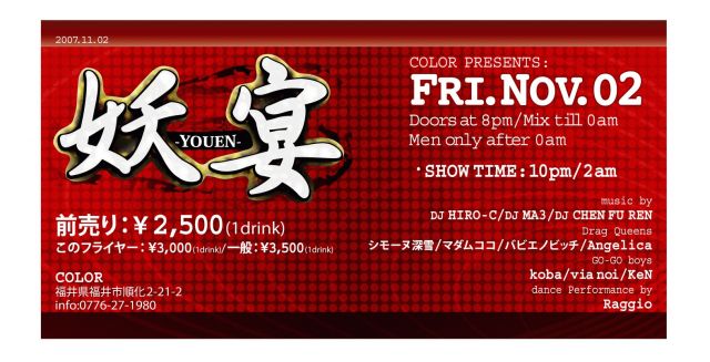 DOOR : 2,500yen/1D W.F & ADV : 2,300yen/1D