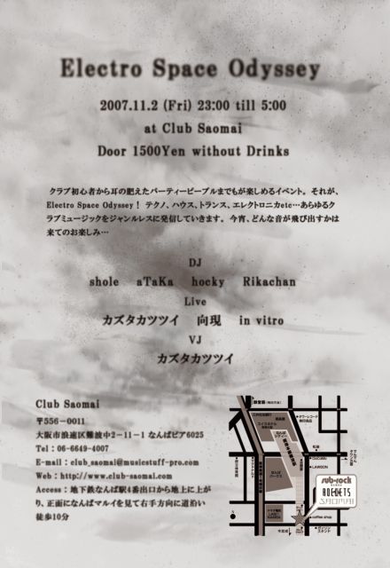 クラブ初心者から耳の肥えたパーティーピープルまでもが楽しめるイベント。それが、Electro Space Odyssey!テクノ、ハウス、トランス、エレクトロニカetc…あらゆるクラブミュージックをジャンルレスに発信していきます。今宵、どんな音が飛び出すかは来てのお楽しみ…