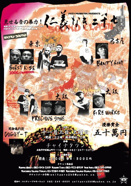 仁義なき2k7 日時 11/3(土) OPEN 22:00 WAR START 12:00 場所 チャイナタウン(広島) 料金 前売り¥2500 当日¥3000 エントリーサウンド BURST RISE(東京) 仁義なき戦い2k6チャンピオン BANTY FOOT(名古屋) FIRE WORKS(大阪) PRECIOUS STONE(大阪) ルール ポイント制 1ラウンド 10分 2ラウンド 10分 3ラウンド 10分 上位2サウンドが勝ち上がり ※ 3ポイント取ったら即優勝! ※ 1ポイントが3サウンドの場合は3サウンドで行う。4ラウンド終了後1サウンド脱落(4ラウンドは通常10分で