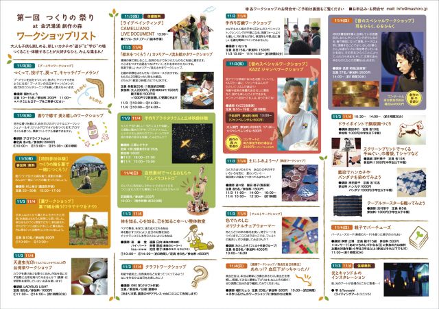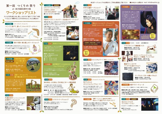 ようやく、つくりの祭りワークショップとコンサートの詳細が決定しました。 19のワークショップと3つのコンサート+パフォーマンス+プラネタリウム 素晴らしいつくりの仲間が集まってくれました。心より感謝します。 本日10/10(水)〜11/1(木)まで、予約受付を行ないます。 ●予約申込・お問合せ:info@mashiro.jp ■コンサート http://mixi.jp/view_bbs.pl?id=23838486&comment_count=0&comm_id=2523458 ■ワークショップ http://mixi.jp/view_bbs.pl?id=23421269&comm_id=2523458 ■ライブパフォーマンスや特別企画と