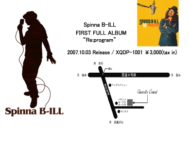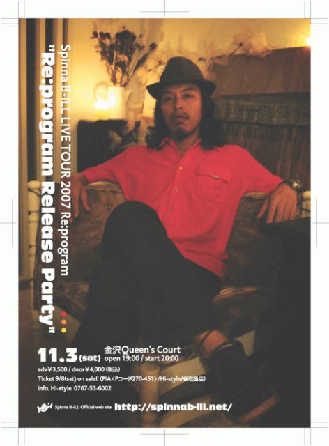 Spinna B-ILL LIVE 全国ツアー 2007 “Re:program” 日時 11/3(sat) OPEN 19:00 / START 20:00 ADV¥3500(チケット限定販売のためお早めに) 場所 金沢Queen's Court コミュhttp://mixi.jp/view_community.pl?id=764274 チケット発売 9月8日(sat) チケットぴあ <Pコード 270−451> サークルK サンクス 問い合わせ ハイスタイル 〒906−0021石川県七尾市本府中町二部42−1 TEL/FAX0767−53−6002 Spinna B-ILL 公式HPhttp://spinnab-ill.net/