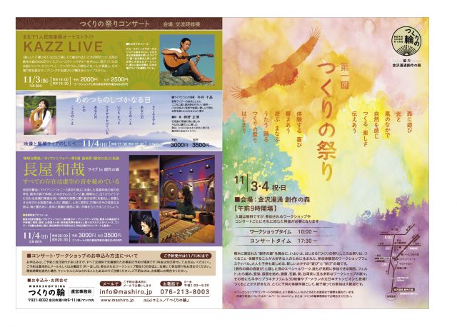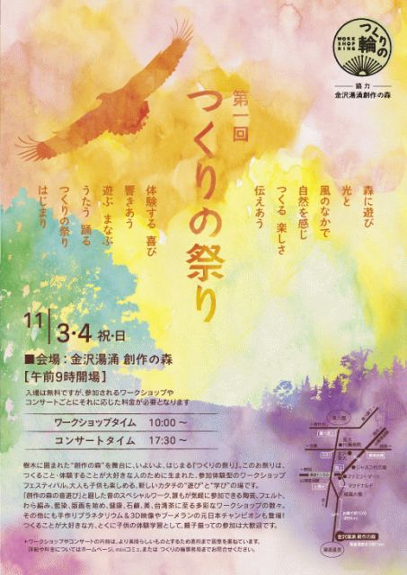 管理人さま、告知失礼いたします。 不適切でしたらお手数ですが、削除お願いいたします。 11/3・4(祝・日) 金沢湯涌創作の森で、つくること・伝えることを皆で楽しむお祭り、 「つくりの祭り」を開催いたします! 森に遊び 光と 風のなかで 自然を感じ つくる 楽しさ 伝えあう 体験する 喜び 響きあう 遊ぶ まなぶ うたう 踊る つくりの祭り はじまり 樹木に囲