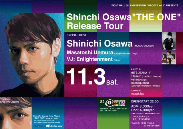 "Shinichi Osawa "The One" Release Tour" 2007/11/03(SAT) START 22:00 @ EIGHT HALL Special Guest:Shinichi Osawa Guest DJ:Masatoshi Uemura (bonjour records) Guest VJ:Enlightenment ENTRANCE FEE: ADV:3,000yen DOOR:4,000yen (入場時、ドリンク代500円必要となります。) ローソンチケット Lコード:53445 DJs: MITSUTAKA_Y Kitasato(LowPitch / monoral) k-shu(Orange) satosequence(LowPitch / monoral / Thyristor) Total Info:EIGHT HALL 076-246-3586