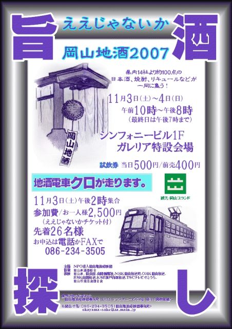 岡山県内14社から約100点の日本酒、焼酎、リキュール等が 一同に揃う岡山地酒の有料試飲販売イベント「ええじゃないか岡山地酒2007」が 今週末あります。 酒のみむらのブースでは芋焼酎「翠王」他、「天恩酒 温羅」、「符羅琶」を試飲販売します。 皆様ぜひお越しくださいませ。 記 【日 時】 平成19年11月3日(土)〜4日(日) <2日間> 3日(土) 10:00〜20:00 4日(日) 10:00〜19:00 【場 所】 岡山シンフォニービル