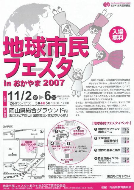 地球市民フェスタinおかやま自主企画イベント シンポジウム 「海の向こうの友だちに 教えてもらったこと!」 〜 国際理解・交流・協力について顧みて考える 〜 ● 日時: 11月3日(土)15:00-16:30 ○ 場所: 岡山県総合グラウンド 学びピア岡山「国際貢献のひろば」自主企画イベント会場 グランドクラブ2階 大研修室 司会: 小川秀樹(岡山大学教授) シンポジスト: ハート・オブ・ゴールドむつみ日本語教室 日本語教師:檜尾 睦 ハート・