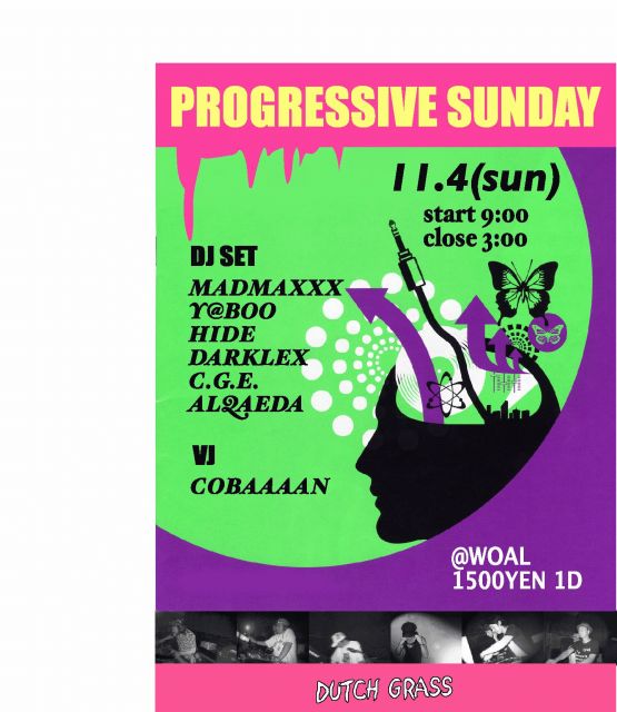 1日の過ごす時間が短く感じられるここ最近。 寒さや寂しさを肌で痛いほど感じ、ソレをはね返すべく強い気持ちを持って歩もうとしている人が多くなった。 こんな時こそ、自分を見つめ、自分で足を進め、自分を信じて突き進んだらきっと春にはイイ事が訪れます。 さあ、皆さんの要望に答えて Produced by DUTCH GRASS http://mixi.jp/view_community.pl?id=2632285 【PROGRESSIVE SUNDAY】 2007/11/4(Sun) @WOAL(Takasaki) http://members3.jcom.home.ne.jp/woal/ START 9:00〜 CLOSE 2:00 1500YEN/1DRINK いよいよ待