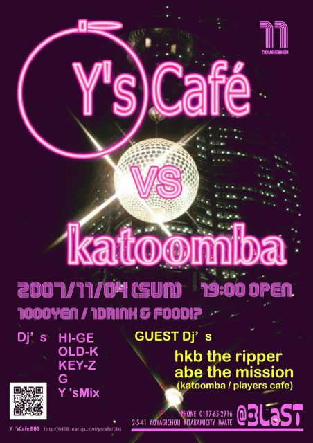 明日は! 『Y'sCafe VS katoomba』 あのplayers cafeのボス「hkb the ripper」氏がY'sCafeでDJしちゃいます! そしてあの和物界のカリスマ「abe the mission」氏も一緒にDJします! すごい夜になりそうです! ちなみに今月のメニューは 「カボチャのシチュー」 「ナポリタン」 の予定です! Y'sCafe11月号 2007年11月4日(sun) 19:00 open 1000yen / 1drink & FOOD!? @BLaST(岩手県北上市) DJ's HI-GE OLD-K KEY-Z G Y's Mix GUEST DJ's hkb the ripper abe the mission (katoomba / players cafe)
