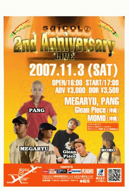 管理人様告知失礼します。 2007年11/2,11/3,11/4にMEGARYU,PANGが沖縄県の宮古ー那覇ー石垣アイランドツアー2007が開催します!! 11/2(金曜日)宮古島 ■会場:aba220 3Fホール ■時間:/18:00(開場) 19:00(開演) ■出演アーティスト: ゲスト MEGARYU,PANG 宮古島アーティスト ハーベスタ ■料金:前売り ¥2,500円 当日 ?3,000円 ■プレイガイド: BOOK BOX・WOODCHUCK・BERNIE‘S GROUP・musica Bar・ Bar PULSE 11/3(土曜日)那覇 ■会場:CLUB LOUNGE saicoLo ■時間:/16: