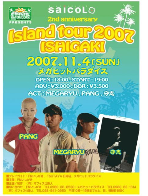 管理人様告知失礼します。 2007年11/4にMEGARYU,PANGが石垣アイランドツアー2007が開催します!! 11/4(日曜日)石垣 ■会場:メガヒットパラダイス ■時間:/18:00(開場) 19:00(開演) ■出演アーティスト: ゲスト ー MEGARYU、PANG 石垣島アーティストー守志 ■料金:前売り ¥3,000円 当日 ¥3,500円 ■プレイガイド:FMいしがき、 TSUTAYA 石垣店、メガヒットパラダイス お近くの方は是非お友達お誘いのうえ遊びにきてください。