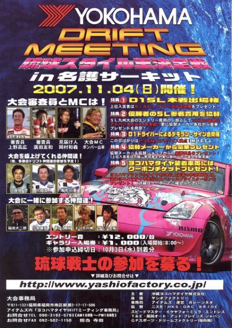 YOKOHAMA主催のドリフト大会。 エフゼロからも、多数エントリー! 大会での活躍に期待大です^^ ギャラリー入場券 ¥1,000(入場開始:8時〜) みんな、応援しに来て下さいね〜