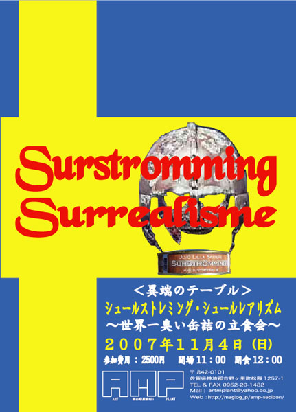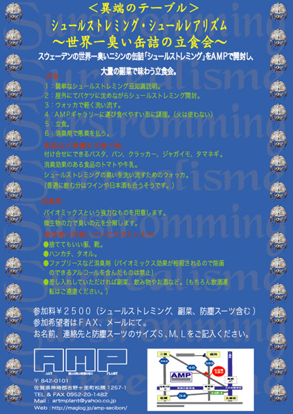 【 異端のテーブル 】 〜世界一臭い缶詰の立食会〜 Surstromming Surrealisme(シュールストレミング・シュールレアリズム) 2007年11月4日(日) 開催場所AMP 参加費用:2500円 ・内容 スウェーデンの世界一臭いニシンの缶詰「シュールストレミング」をAMPで開封し、 大量の副菜で味わう立食会。 臭い対策に全身を覆う防塵スーツを着用。 シュールな格好でシュールストレミングを食う・・・と韻を踏んでたりもします。 珍しいイベントのため当日は映像撮影もあります。 ・シュールストレミングとは?