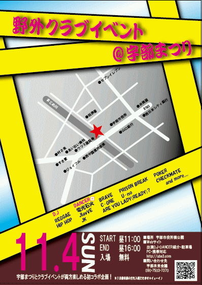 告知させて下さい!! 私達は「宇部をもっと楽しい街にしてやろう!」という志をもった若者の集まりです。 今回私達は、宇部でもっとも大きなお祭の「宇部まつり」にて、宇部周辺の若者達が参加し足を運ぶような“若者達がより楽しめる祭にしたい”という熱意のもと、「宇部まつり」にて野外イベントを開催することにしました。 私達の熱い思いに少しでも共感を持っていただけましたら、是非『野外クラブイベント@宇部まつり』への出演(年齢問わず、無料)をお願いします。 【イベント情報】 ■日時 11月4日(日) 11:00〜16: