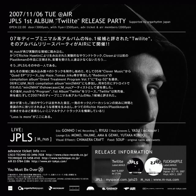 2007.11.6(tue) open 22:00 JPLS 1st Album "Twilite"Release Party - Guest Live:JPLS(m-nus) DJs:GONNO(WC Recording) , ryuu(Real Grooves) , YASU(MICROSURF) Lounge DJs:momo, Hajme, Ama & Genki, Yutaka Kondo Visual Effect:CHIMAERA CRAFT Food:soup - original tacos and sweets. ¢¢¢¢¢¢¢¢¢¢¢¢¢¢¢¢¢¢¢¢¢¢¢¢¢¢¢¢¢¢¢¢¢¢¢¢¢¢¢¢¢¢¢¢¢¢¢¢¢¢¢¢¢¢¢¢¢¢¢¢¢¢¢¢¢¢¢¢¢¢ ¡ÚIntrodution¡Û M_nus¤¬ºÆ¤Ó¼Â¸³Åª¤ÊÎΰè¤ËƧ¤ß¹þ¤à¡£ ¤«¤Ä¤ÆRichie Hawtin¤Ë¤è¤êÀ¸¤ß½Ð¤µ¤ì¤¿¼Â¸³Åª¤Ê¥µ¥¦¥ó¥É¥È¥é¥Ã¥¯¡¢Closer ¤è¤ê°ÊÁ°¤ÎPlastikman¤Î