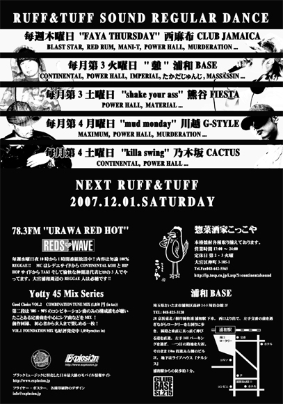RUFF&TUFF 11/06(ÅÚ) ¾ì½ê¡§±ºÏÂBase ÎÁ¶â¡§2,000±ß/1D ASK¡§ruff_and_tuff@hotmail.co.jp INFO¡§http://sound.jp/expro/m/rufftuff/ ¢£GUEST SOUND ANTENNA DISCO http://mixi.jp/view_community.pl?id=2306150 http://www.myspace.com/antenna45disco ¢£SOUND CONTINENTAL with soundsystem POWER HALL MURDERATION ¢£RUB A DUB FINGA aka ¿Æ»ØHEAD ¤¿¤«¤À¤¸¤å¤ó¤¸ MASSASSIN and more!!! ¢£±ºÏÂBase ½»½ê¡§ºë¶Ì¸©¤µ¤¤¤¿¤Þ»Ô±ºÏ¶è¹âº½2-1-5 ºëÍá²ñ´Û2F TEL¡§ 048-825-3120 [flyer] EXPLOSION ¥Ö¥é¥Ã¥¯¥ß¥å
