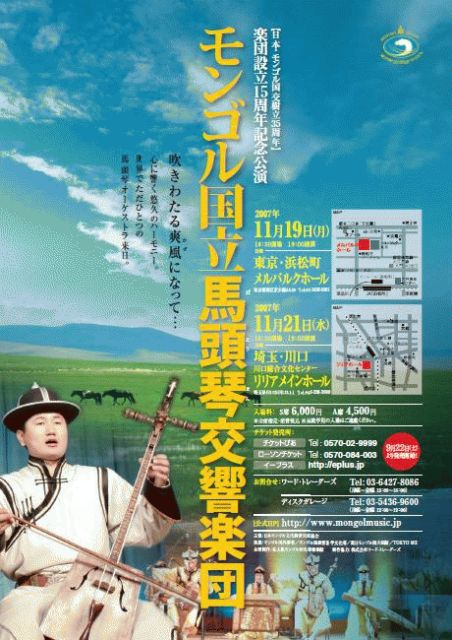 今年の11月にモンゴルの馬頭琴楽団のコンサートツアーがあります。東京、大阪をはじめ7公演が開かれます。 詳しい情報は公演用ウェブページへ ↓ http://www.mongolmusic.jp/?mixi3